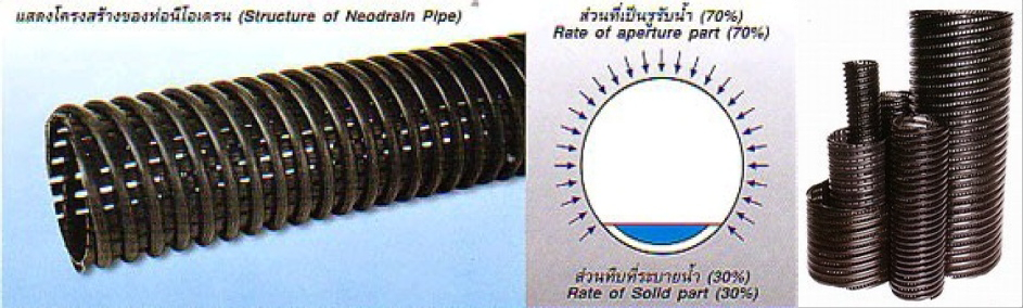 1. ระบายน้้าได้รวดเร็ว ( Fast Drainage)ท่อนีโอเดรนมีพื้นที่ ที่มีรูรับน้าได้ถึง 70 เปอร์เซ็นต์ และส่วนทึบ 3 % จึงสามารถระบายน้าได้มากและรวดเร็ว